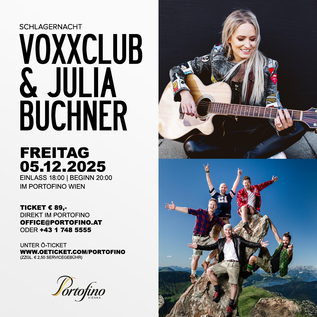 Konzert mit Voxxclub & Julia Buchner. Ticketpreis € 89,- inklusive Sektempfang. Herzlich Willkommen.